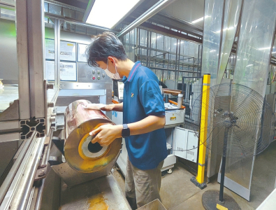 在運城制版集團的生產(chǎn)車間內,工作人員正在檢查鍍銅后的版輥。本報記者周明飛攝