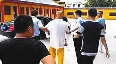 這是安徽蚌埠警方實施的一次抓捕行動。被帶走時,釋廣聞身著白色寬松上衣、黃色僧袍褲子,沒有任何反抗,表情平靜。