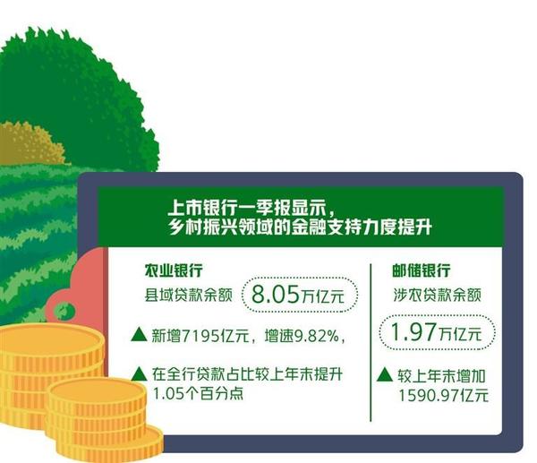 近日,各家上市銀行一季報先后披露完畢。從公開數(shù)據(jù)看,中國農業(yè)銀行、中國郵政儲蓄銀行等在鄉(xiāng)村振興領域的金融支持力度持續(xù)提升。其中,農業(yè)銀行縣域貸款余額達8.05萬億元,新增7195億元,增速9.82%,增量創(chuàng)歷史同期新高,在全行貸款占比較上年末提升1.05個百分點。郵儲銀行涉農貸款余額1.97萬億元,較上年末增加1590.97億元;建成信用村38.69萬個,評定信用戶超千萬戶,主動授信白名單客戶貸款本年凈增366.20億元。