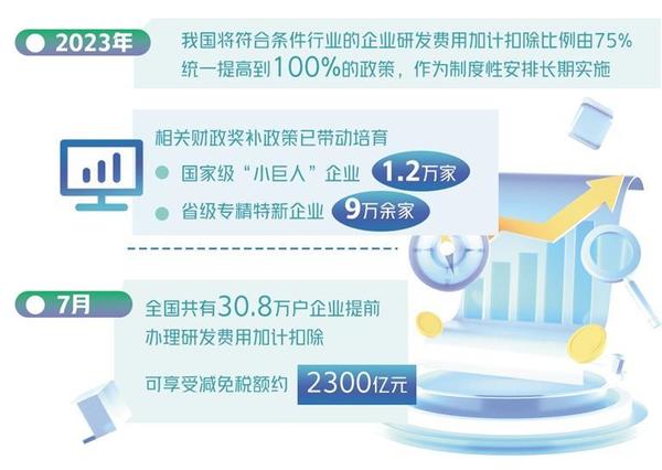 “為切實(shí)保證這一新的惠企政策落實(shí)到位,稅務(wù)部門依托稅收大數(shù)據(jù)篩選符合條件的企業(yè),定向開展政策精準(zhǔn)推送和宣傳輔導(dǎo),確保企業(yè)‘知曉政策’;會(huì)同科技部門及時(shí)發(fā)布《研發(fā)費(fèi)用加計(jì)扣除政策執(zhí)行指引2.0》,細(xì)化政策口徑,確保企業(yè)‘會(huì)用政策’;第一時(shí)間優(yōu)化升級(jí)征管系統(tǒng),改進(jìn)電子稅務(wù)局功能,讓納稅人‘足不出戶’即可快捷辦理,確保企業(yè)‘用好政策’?!眹?guó)家稅務(wù)總局新聞發(fā)言人、辦公廳主任黃運(yùn)介紹。從7月份政策落實(shí)情況看,全國(guó)共有30.8萬戶企業(yè)提前辦理研發(fā)費(fèi)用加計(jì)扣除,可享受減免稅額約2300億元。