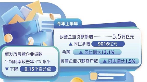 近年來,信貸支持民營企業(yè)的力度不斷加大,融資成本穩(wěn)中有降。數(shù)據(jù)顯示,今年上半年,民營企業(yè)貸款新增5.5萬億元,同比多增9016億元,余額同比增長13.1%;民營企業(yè)貸款客戶數(shù)同比增長1.5%;新發(fā)放民營企業(yè)貸款平均利率較去年平均水平下降0.15個百分點。