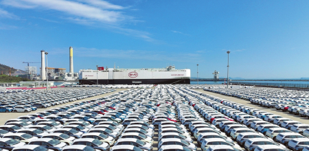 1月14日,“BYD EXPLORER NO.1”(比亞迪“開拓者1號”)滾裝船抵達深圳港小漠國際物流港。