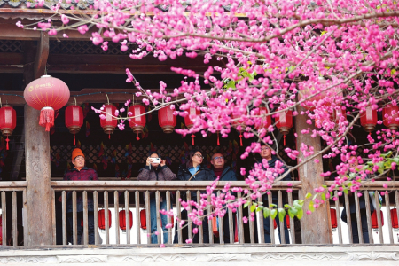 2月17日,游客在重慶市黔江區(qū)濯水古鎮(zhèn)賞梅。