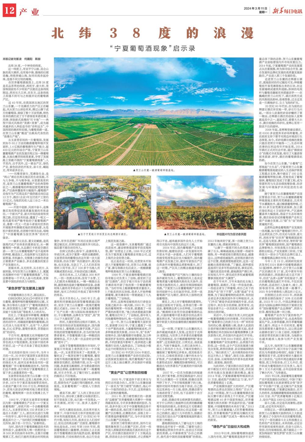 從玉泉營農(nóng)場的一片葡萄園,發(fā)展到如今60.2萬畝的釀酒葡萄種植開發(fā)面積、1.4億瓶的葡萄酒年生產(chǎn)能力、超400億元的年綜合產(chǎn)值,寧夏賀蘭山東麓葡萄酒產(chǎn)業(yè)的發(fā)展歷程正如一棵葡萄藤,從抽出嫩芽到碩果累累,孕育了發(fā)展路上堅毅不撓的“寧夏葡萄酒現(xiàn)象”。入乎其內(nèi)、出乎其外,這一黃金產(chǎn)區(qū)、綠色產(chǎn)業(yè)、紫色經(jīng)濟的開拓史、奮斗史、崛起史,帶來諸多啟示。
