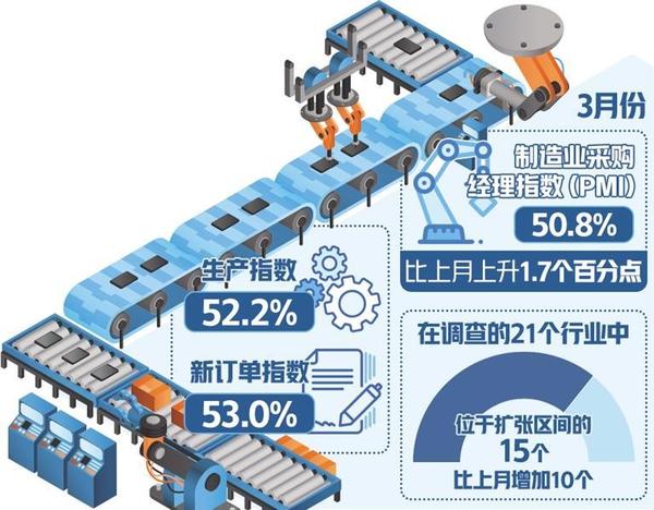 “3月份PMI指數(shù)大幅回升,且重回榮枯線之上,既有季節(jié)性因素影響,也表明經(jīng)濟(jì)回升向好態(tài)勢進(jìn)一步明確?!眹鴦?wù)院發(fā)展研究中心研究員張立群表示。