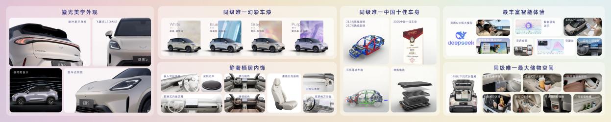 步入“舒嶼座艙”,細節(jié)皆巧思。繽果S以“靜奢棲居美學”為靈感,通過環(huán)抱式布局、貫穿式內(nèi)嵌風幕與柔感貝殼座椅等設計,營造出沉浸式的舒適氛圍。搭配同級唯一的6揚聲器系統(tǒng)與阿嘉米斯專業(yè)聲場調校,進一步提升了座艙的靜謐質感與聽覺享受。12.8英寸高清大屏內(nèi)置“1+N”靈語AI中樞大模型,深度融合DeepSeek大模型,以更全面的壁紙玩法、八大區(qū)域的方言溝通、更多的智能場景應用,為用戶帶來真正“更懂你的”智能座艙體驗。