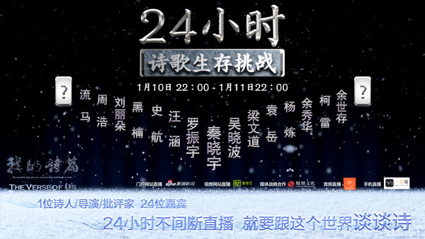 據(jù)了解,從1月10日晚22:00開(kāi)始,秦導(dǎo)邀請(qǐng)了24位各界知名人士,24小時(shí)不間斷直播接力談詩(shī)歌。自媒體“羅輯思維”創(chuàng)始人羅振宇,著名財(cái)經(jīng)作家、財(cái)經(jīng)自媒體“吳曉波頻道”創(chuàng)始人吳曉波,國(guó)際著名詩(shī)人楊煉,香港著名文化人梁文道,湖南衛(wèi)視著名主持人汪涵,自媒體人袁岳,著名知識(shí)分子余世存,詩(shī)人余秀華,詩(shī)人、詩(shī)歌自媒體“讀首詩(shī)再睡覺(jué)”公號(hào)主編流馬,編劇史航,金馬獎(jiǎng)最佳紀(jì)錄片導(dǎo)演周浩,歐洲著名漢學(xué)家柯雷,著名音樂(lè)人黑楠等人,將通過(guò)現(xiàn)場(chǎng)、電話(huà)連線(xiàn)、視頻等多種方式參與本次在線(xiàn)直播活動(dòng),而鳳凰衛(wèi)視著名主持人曹景行、著名主持人崔永元以及詩(shī)歌評(píng)論家唐曉渡也有望一起參與。
