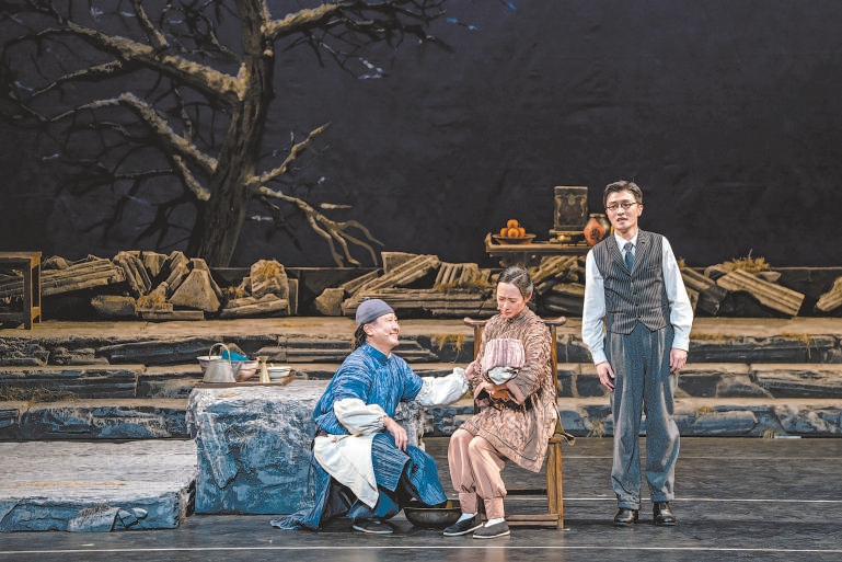 故事中的“煙火氣”則體現(xiàn)在兩處舞臺(tái)設(shè)置上:垂下的紗簾幕自由展現(xiàn)出各種城市風(fēng)貌與相關(guān)故事元素;一棵高大的樹立于其中,帶來(lái)堅(jiān)硬又孤零的氣息。舞美設(shè)計(jì)李彪說(shuō):“北京題材的戲,我繞不開這棵樹,是冥冥之中的感覺(jué)?!痹谒恢币詠?lái)的感受里,老舍先生就如這樣一棵樹,“孤獨(dú)……又有生生不息的感覺(jué),雖然是一棵冬天的沒(méi)有樹葉的樹,周圍環(huán)境也很寒冷,但樹立在那里,是又孤獨(dú)又溫馨的。”