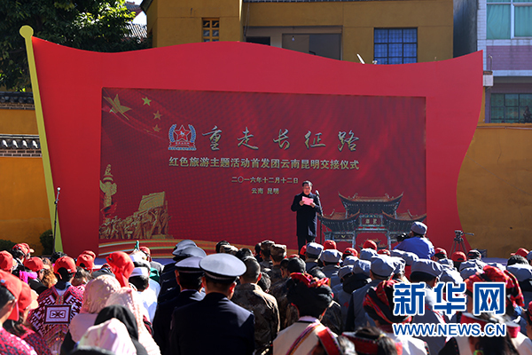 新華網(wǎng)昆明12月13日電(記者 韓攀)12月12日,“重走長(zhǎng)征路”紅色旅游主題活動(dòng)首發(fā)團(tuán)云南昆明交接儀式在尋甸柯渡丹桂村紅軍長(zhǎng)征柯渡紀(jì)念館舉行。本次主題活動(dòng)由國(guó)家旅游局主辦,是在中國(guó)工農(nóng)紅軍長(zhǎng)征勝利80周年之際,通過(guò)紀(jì)念紅軍長(zhǎng)征歷史、緬懷先烈,宣傳長(zhǎng)征精神,推廣紅色旅游線(xiàn)路,同時(shí)充分展示長(zhǎng)征沿線(xiàn)地區(qū)旅游業(yè)及經(jīng)濟(jì)發(fā)展成就。