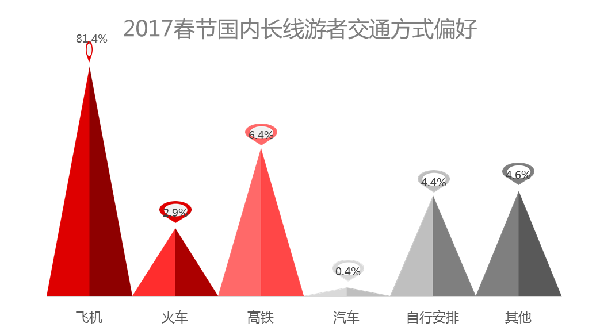 出游交通工具選擇方面,81.4%的國(guó)內(nèi)長(zhǎng)線游者選擇了飛機(jī)(選擇了以飛機(jī)為交通方式的旅游團(tuán)或自由行套餐),其次是高鐵,占比6.4%。