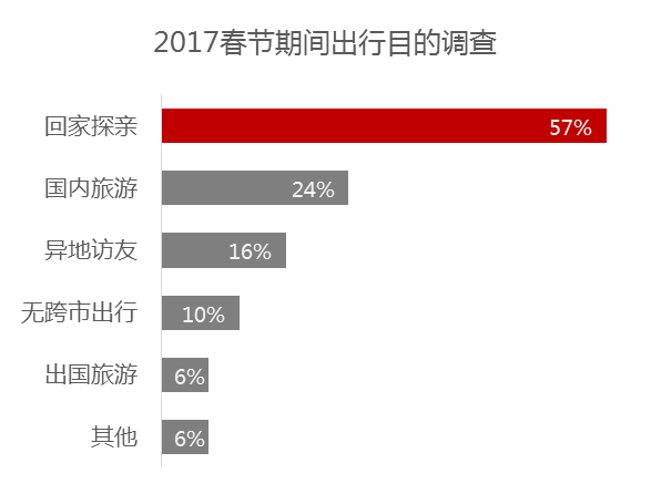 《報(bào)告》關(guān)于2017年春節(jié)跨市出行(長(zhǎng)途出行)意愿的在線問(wèn)卷調(diào)查數(shù)據(jù)顯示,“回家探親”是受訪者春節(jié)期間長(zhǎng)途出行的第一大動(dòng)機(jī),“國(guó)內(nèi)旅游”則是第二大出行動(dòng)機(jī)??傮w而言,受訪者能夠明確給出的春節(jié)出行動(dòng)機(jī)中,除了“回家探親”,就是旅游(國(guó)內(nèi)游和出境游)。這表明,居民2017年春節(jié)期間的旅游消費(fèi)意愿強(qiáng)烈,旅游過(guò)年已經(jīng)成為較為主流的過(guò)年方式。