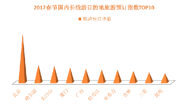 一般情況下,春節(jié)期間的國(guó)內(nèi)長(zhǎng)線游(行程3日以上,居住地300公里外)需求的出游人數(shù)在總體長(zhǎng)線游需求中占比最大?!秷?bào)告》數(shù)據(jù)顯示,北京、哈爾濱、長(zhǎng)白山、廈門(mén)、廣州、牡丹江、亞布力、吉林、三亞、昆明是2017年春節(jié)期間最熱門(mén)的十個(gè)目的地(以《報(bào)告》發(fā)布時(shí)的線路預(yù)訂數(shù)據(jù)統(tǒng)計(jì)),其中哈爾濱、長(zhǎng)白山、牡丹江、亞布力、吉林五個(gè)目的地全部來(lái)自東北地區(qū),春節(jié)期間冰雪游線路的火爆是它們上榜的共同原因,廈門(mén)、三亞、昆明等則為黃金周國(guó)內(nèi)游傳統(tǒng)熱門(mén)目的地。另外,不同城市居民春節(jié)國(guó)內(nèi)長(zhǎng)線游的目的地偏好略有差異,例如,北京最受歡迎的春節(jié)國(guó)內(nèi)游目的地主要有廣州、珠海、哈爾濱、長(zhǎng)白山,上海最受歡迎的春節(jié)國(guó)內(nèi)游目的地主要有長(zhǎng)白山、北海、三亞、北京等,廣州最受歡迎的春節(jié)國(guó)內(nèi)游目的地主要有貴陽(yáng)、張家界等。
