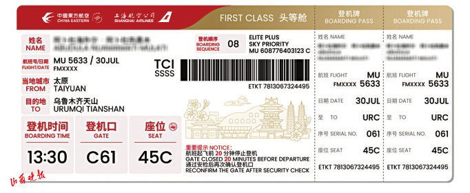 此次升級不僅注重文化表達,更著力提升服務體驗。登機牌對登機口、起飛時間、座位號等關鍵信息進行了“放大提亮”處理,通過字體加粗、色彩對比等設計,顯著提升了信息辨識度,特別方便老年旅客快速獲取信息,有效降低誤機風險,體現(xiàn)了東航精細化服務理念。