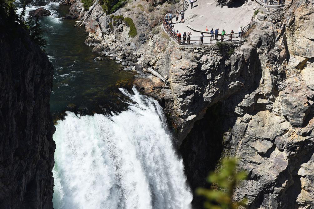 2019年9月3日,游客在美國黃石國家公園觀賞下瀑布。新華社記者韓芳攝