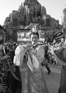49歲的知名演員鄭國(guó)霖身著明黃龍袍、金冠束發(fā)、嘴叼玫瑰,騎著摩托車(chē)載著另一位扮演“秦始皇”的演員呼嘯而過(guò)。兩位“千古一帝”的魔性互動(dòng)引得現(xiàn)場(chǎng)游客陣陣歡呼。這并非影視劇拍攝現(xiàn)場(chǎng),而是上海千古情景區(qū)的日常一景。