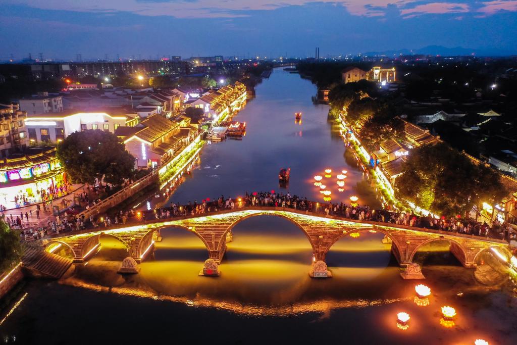 10月2日,游客在塘棲古鎮(zhèn)的廣濟橋觀賞運河夜景(無人機照片)。新華社記者 徐昱 攝