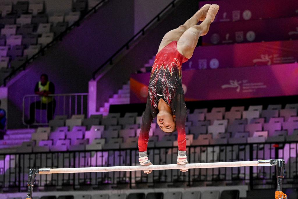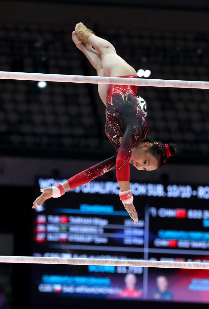 10月21日,中國選手張清穎在高低杠項(xiàng)目比賽中。新華社發(fā)(阿貢·昆卡亞攝)