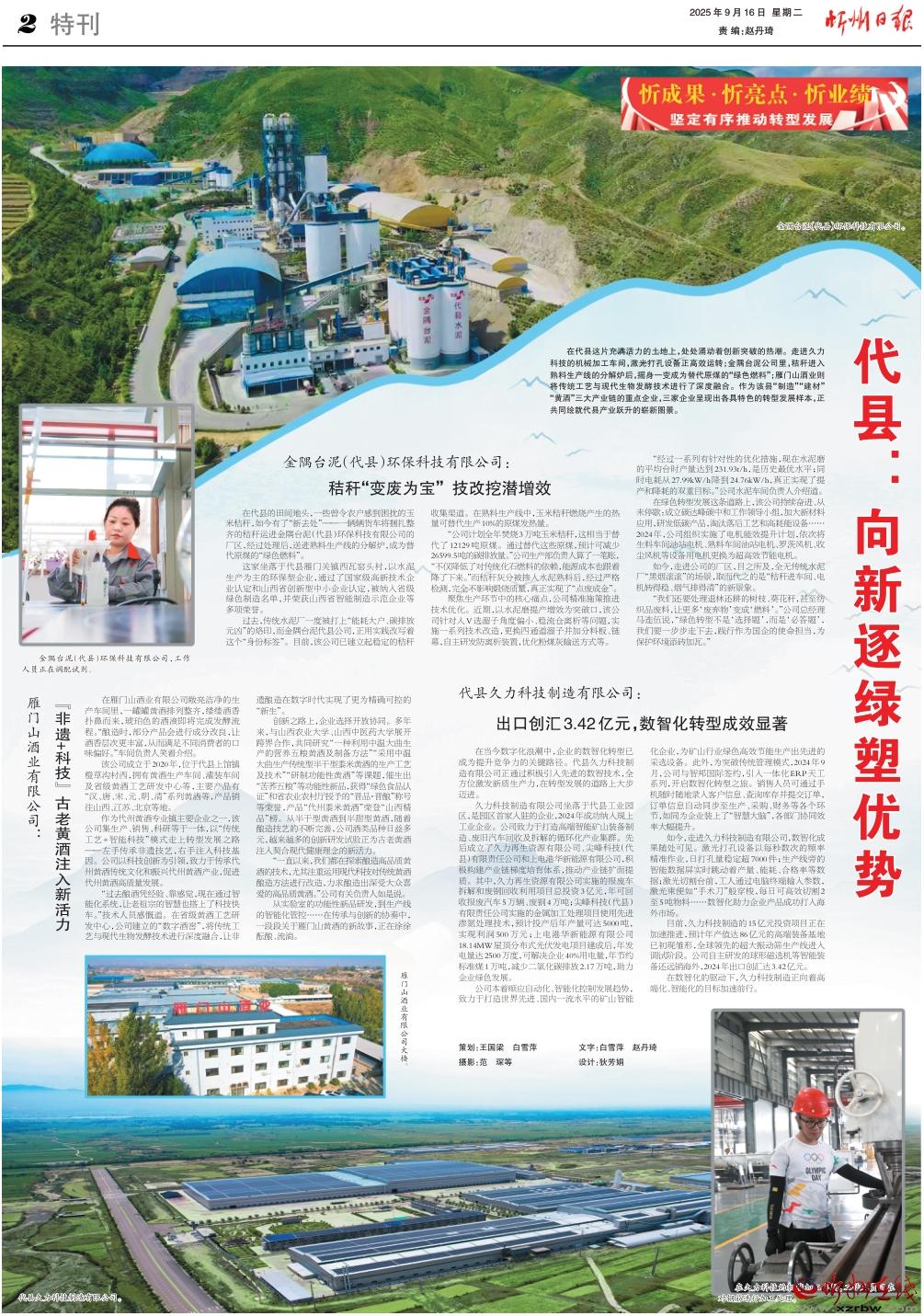 在代縣這片充滿活力的土地上,處處涌動著創(chuàng)新突破的熱潮。走進久力科技的機械加工車間,激光打孔設(shè)備正高效運轉(zhuǎn);金隅臺泥公司里,秸稈進入熟料生產(chǎn)線的分解爐后,搖身一變成為替代原煤的“綠色燃料”;雁門山酒業(yè)則將傳統(tǒng)工藝與現(xiàn)代生物發(fā)酵技術(shù)進行了深度融合。作為該縣“制造”“建材”“黃酒”三大產(chǎn)業(yè)鏈的重點企業(yè),三家企業(yè)呈現(xiàn)出各具特色的轉(zhuǎn)型發(fā)展樣本,正共同繪就代縣產(chǎn)業(yè)躍升的嶄新圖景。