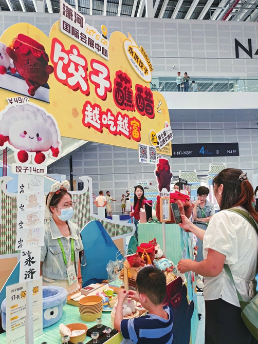 胖乎乎的餃子、圓墩墩的醋缸,摸一摸,毛絨絨的,手感柔順細滑。8月24日,第七屆山西文博會現(xiàn)場,位于山西瀟河國際會展中心N4館的文創(chuàng)山西展區(qū),永濟市晉韻原創(chuàng)文創(chuàng)工作室獨特而醒目的門頭——“餃子蘸醋 越吃越富”,吸引了眾多參觀者的目光。該工作室展出的餃子蘸醋系列毛絨文創(chuàng)產(chǎn)品,也受到參觀者的關(guān)注和喜愛。