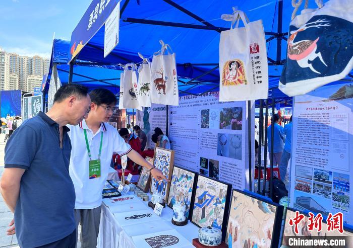 7月14日,酒泉職業(yè)技術(shù)學(xué)院學(xué)生王皓向觀眾介紹敦煌文創(chuàng)作品。中新社記者 丁思 攝 “我們喜歡潮流的新事物,也喜歡古老的優(yōu)秀傳統(tǒng)文化,敦煌文化是我最感興趣的?!?9歲的王皓是酒泉職業(yè)技術(shù)學(xué)院研學(xué)旅行管理與服務(wù)專業(yè)的學(xué)生,他告訴記者,要成為優(yōu)秀的研學(xué)導(dǎo)師,豐富的歷史理論和動手實踐能力必不可少,參加學(xué)校的非遺課堂,讓他收獲了這兩方面的知識。 王皓的導(dǎo)師是酒泉職業(yè)技術(shù)學(xué)院教授王權(quán)朝,他是甘肅省級非遺項目“敦煌石粉彩繪技藝”傳承人,依托敦煌剪紙、陶瓷釉下彩繪等非遺技藝,進(jìn)行非遺創(chuàng)新設(shè)計,文創(chuàng)產(chǎn)品有茶具、團(tuán)扇、背包、抱枕等。 王權(quán)朝的課還受到該校留學(xué)生歡迎,他收了不少“洋弟子”,為他們講述敦煌壁畫藝術(shù)相關(guān)課程,并進(jìn)行敦煌壁畫白描、泥板畫等實操訓(xùn)練。他告訴記者,今年他還開啟線上教學(xué),錄制課程《敦煌壁畫藝術(shù)》,以通俗易懂的講解語言,直觀的圖片和操作視頻,讓海外觀眾不僅可以學(xué)習(xí)中文,還可以近距離感受敦煌藝術(shù)。