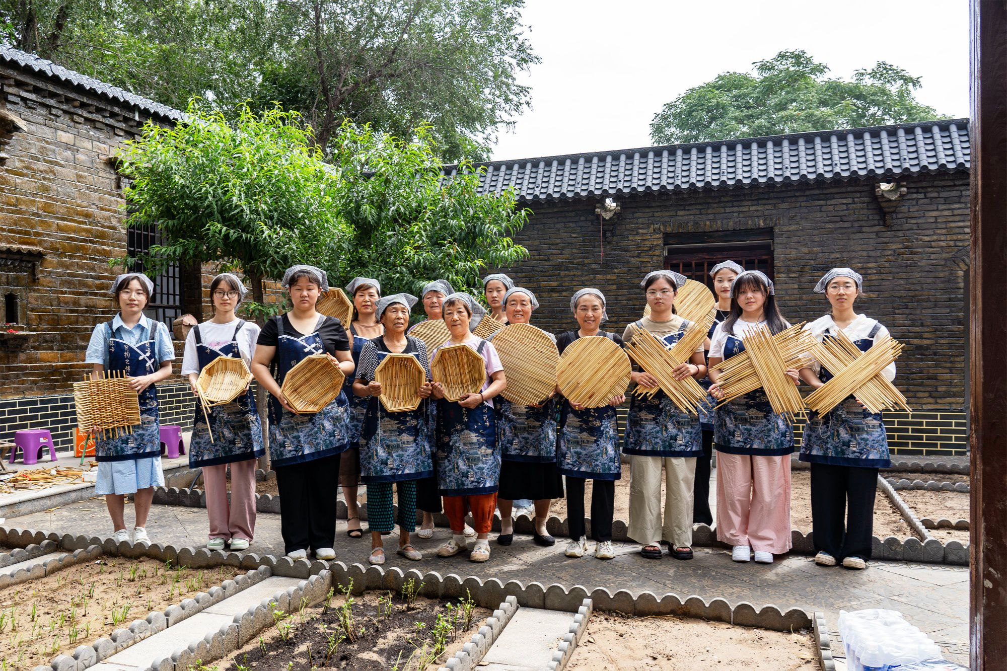 現(xiàn)場,青磚灰瓦老式房屋建筑,充滿年代感。幾位年近70歲的老藝人在院中圍坐,制作起箅簾來動作嫻熟,眼隨手走,針線在高粱稈間上下穿梭,擠緊、壓實(shí)、細(xì)縫、剪圓,每道工序十分嚴(yán)謹(jǐn)。學(xué)生們有模有樣地學(xué)做,不時向老人請教交流,現(xiàn)場氣氛活躍、趣味十足。一個多小時,一個個手工制作的箅簾、兜嘍箅基本成型,看著自己的勞動成果,大家臉上洋溢著喜悅的笑容。