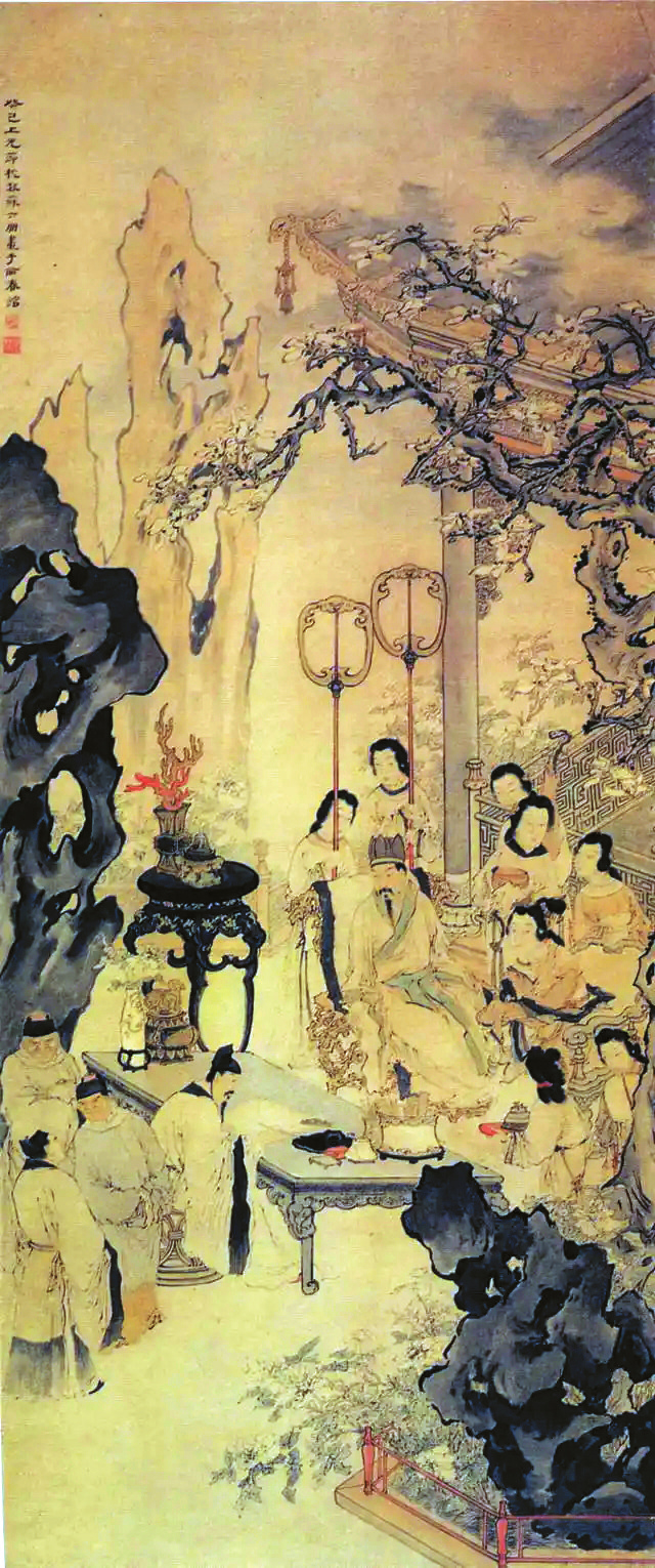 唐人李濬的《松窗雜錄》載,李白在長安任翰林待詔時,一日宮中牡丹綻放,唐玄宗與楊貴妃前往賞花,找來李龜年等人奏樂歌唱。但玄宗看了歌單,覺得都是些過氣的舊曲子,配不上眼前的名花美女,就讓李龜年趕快去找李白填新詞。當時李白宿醉未醒,趁著酒力秉筆賦詞,當場寫就三首《清平調》歌頌楊貴妃的美貌。待李龜年唱完,楊貴妃很高興,還親自領唱了這三首歌。唐玄宗也吹著玉笛伴奏,由此奠定了李白在盛唐詩壇“一哥”的重要地位。李白創(chuàng)作樂府詩的事情被收入《舊唐書》:“玄宗度曲,欲造樂府新詞,亟召白,白已臥于酒肆矣。召入,以水灑面,即令秉筆,頃之成十余章,帝頗嘉之。”這段關于李白的佳話,在中國詩歌史上留下濃墨重彩的一筆。