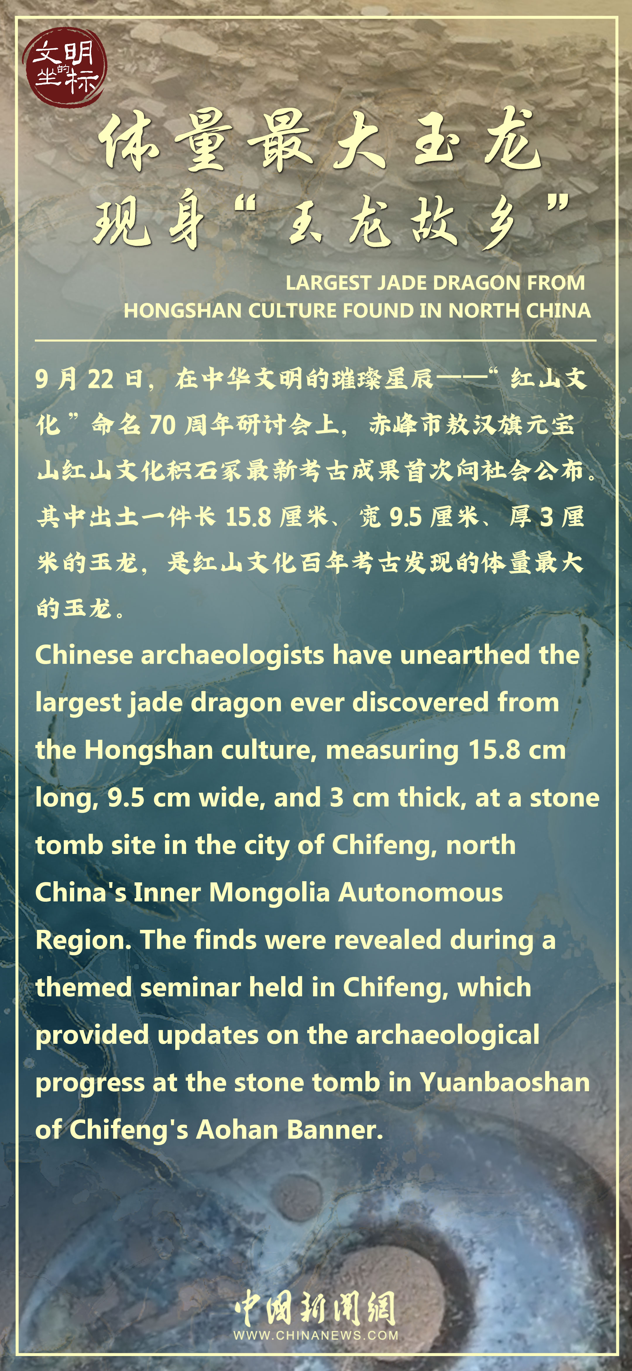 紅山文化因內(nèi)蒙古赤峰市紅山后遺址的發(fā)現(xiàn)、發(fā)掘而得名,至今已有70年。近日,紅山文化考古再一次“上新”。9月22日,赤峰市敖漢旗元寶山紅山文化積石冢最新考古成果首次向社會公布,其中出土的一件長15.8厘米、寬9.5厘米、厚3厘米的玉龍,是紅山文化百年考古發(fā)現(xiàn)的體量最大的玉龍。“龍”,中國人最親切的身份認同,也是紅山文化最突出的元素之一。早在1971年,被考古界譽為紅山文化象征的“中華第一龍”——紅山碧玉龍在赤峰市紅山文化遺址出土,赤峰市也因此被譽為“中華玉龍之鄉(xiāng)”。來“玉龍故鄉(xiāng)”,探尋中華文明的古老根脈。