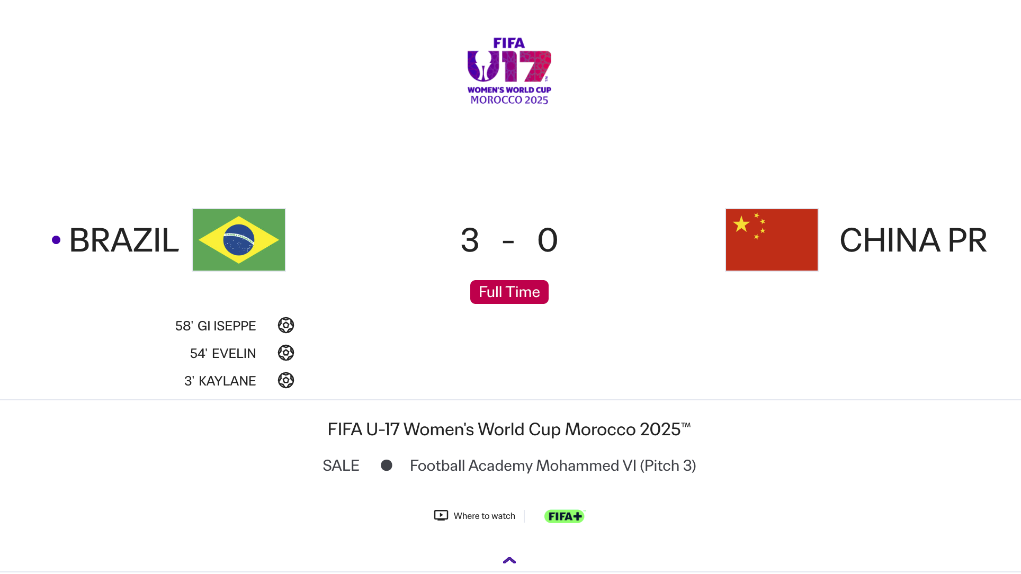 新華社拉巴特10月28日電 在28日進(jìn)行的2025年U17摩洛哥女足世界杯八分之一決賽中,中國(guó)隊(duì)以0:3負(fù)于巴西隊(duì),無(wú)緣八強(qiáng)。